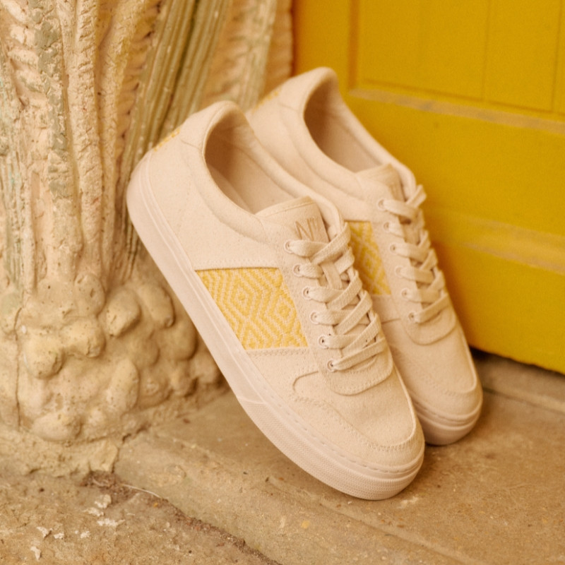 Para garantizar que este par dure más de un verano, los equipos de N'GO seleccionaron una lona gruesa de algodón orgánico con certificación GOTS para la parte superior, el forro interior y los cordones. Al optar por limitar el uso de materiales, N'GO también está limitando la cantidad de transporte implicado en el abastecimiento de los materiales (menos emisiones de CO2) y el reciclaje del par al final de su vida útil (de nuevo, menos emisiones de CO2).